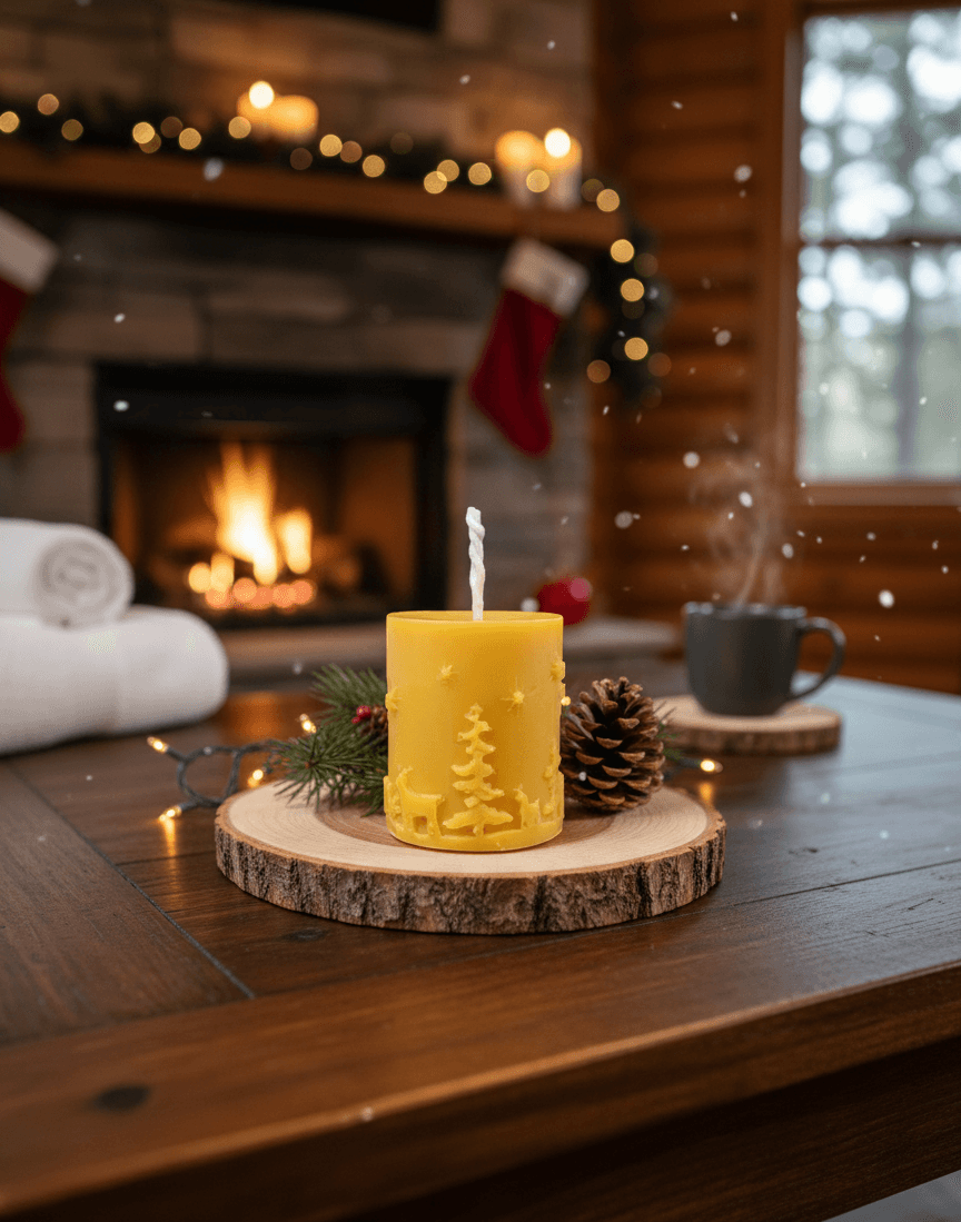 Bougie Noël cylindrique en cire d’abeille : une touche festive et naturelle pour illuminer vos fêtes. Son parfum doux et sa chaleur créeront une ambiance.